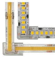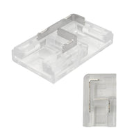The transparent solderless L connector is designed for seamless connections between non-waterproof IP20 COB and SMD LED strips with 8 mm or 10 mm PCB widths, no soldering required. Simply insert the strip and close the side clips for a secure and reliable connection.